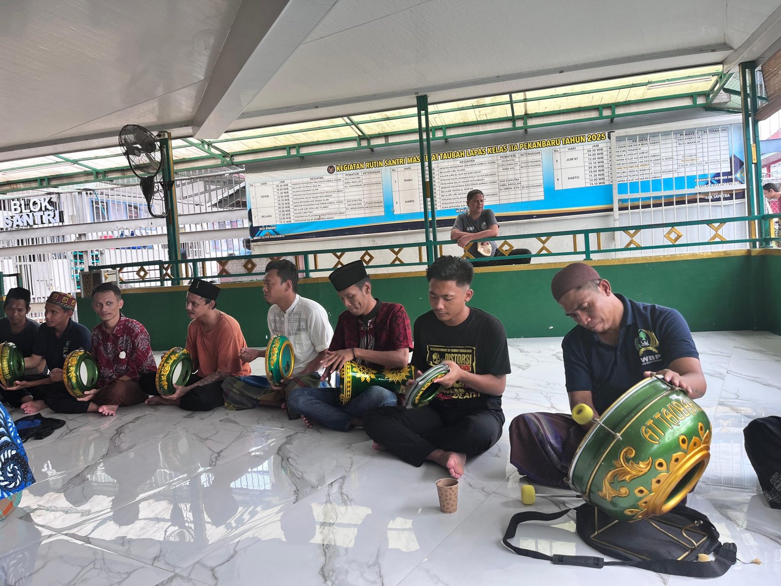 Potretterkini.com – PEKANBARU – Masjid At-Taubah Lembaga Pemasyarakatan (Lapas) Kelas IIA Pekanbaru tampak ramai dan riuh alunan merdu Marawis. Masing-masing warga binaan yang duduk bersila memegang alat musik yang terbuat dari kayu dan kulit lembu itu. Ada juga yang memainkan simbal dan salah seorang menjadi vokalis dalam grup marawis itu. Hari ini memang tengah dilakukan latihan Marawis oleh Warga Binaan Pemasyarakatan (WBP) Lapas Pekanbaru. Kegiatan latihan Marawis dilatih oleh Instruktur professional dan dilaksanakan dua kali dalam seminggu di Masjid At-Taubah Lapas Kelas IIA Pekanbaru, Kamis (29/01/2026).