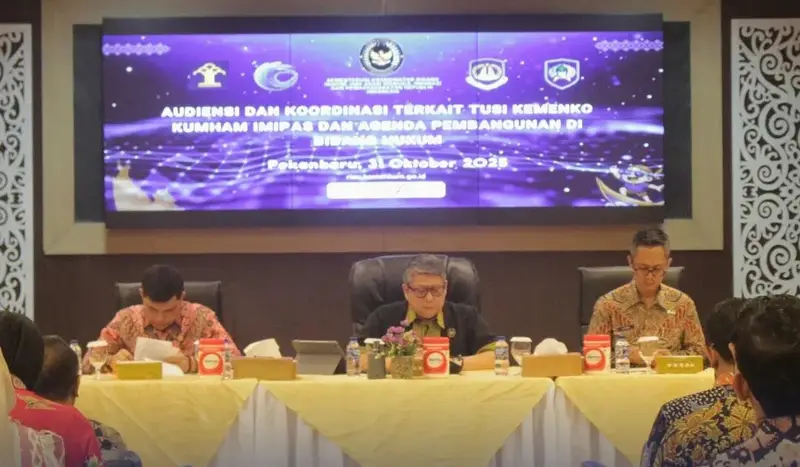 Potretterkini.com – PEKANBARU – Kepala Kantor Wilayah Direktorat Jenderal Pemasyarakatan Riau, Maizar dan jajaran turut menghadiri kegiatan Rapat Sinkronisasi dan Koordinasi Pelaksanaan Tugas dan Fungsi Kementerian Koordinator Bidang Hukum, Hak Asasi Manusia, Imigrasi, dan Pemasyarakatan (Kemenko KumHam Imipas) yang disampaikan langsung oleh Dr. Nofli, Bc.I.P., S.Sos., S.H., M.Si., selaku Deputi Bidang Koordinasi Hukum Kemenko Kumham ImiPas, Jumat (31/10/2025).