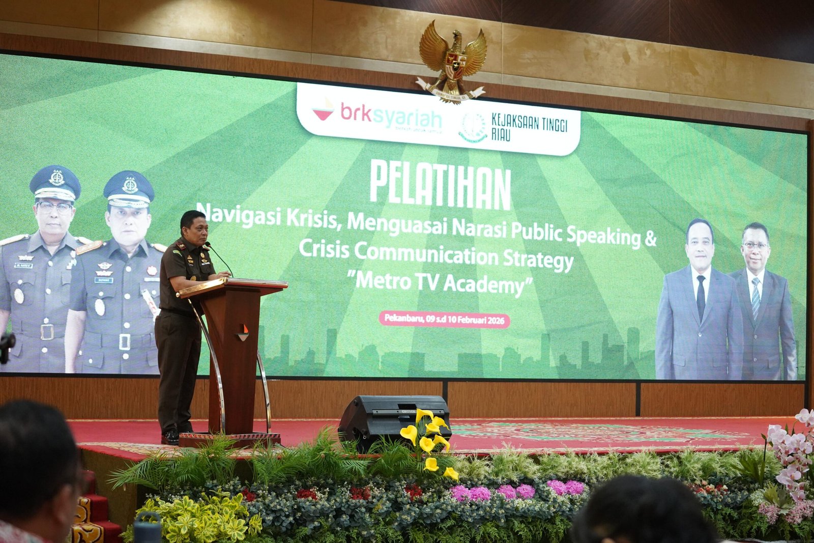 Potretterkini.com – PEKANBARU – Kejaksaan Tinggi Riau menggerlar Pelatihan Navigasi Krisis, Menguasai Narasi Public Speaking & Crisis Communication Strategy bersama Bank Riau- Kepri Syariah dan Metro TV Academy, bertempat di Aula Gedung Dang Merdu Bank Riau- Kepri Syariah dan Sasana H. M Prasetyo Gedung Satya Adhi Wicaksana Kejaksaan Tinggi Riau, Senin (09/02/2026).