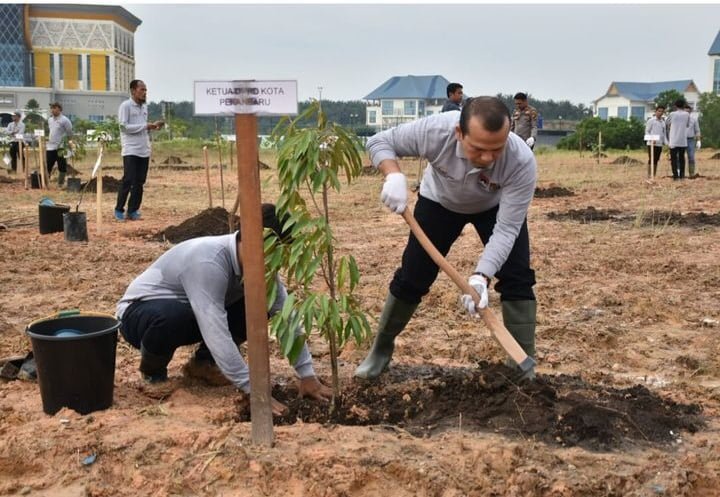 Potretterkini.com, PEKANBARU— Ketua DPRD Kota Pekanbaru Muhammad Sabarudi ikut serta dalam penanaman puluhan bibit pohon pada pada momen Raker Komwil 1 APEKSI 2024. Bibit pohon ini ditanam di sekitar Komplek Pemerintah Kota Pekanbaru, Sabtu (4/5/2024).